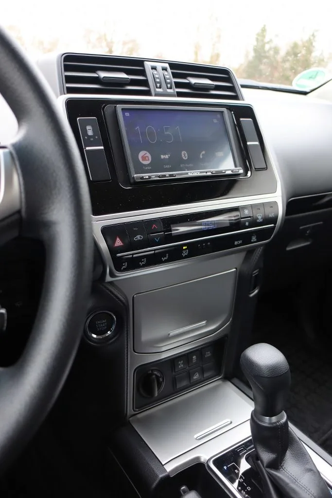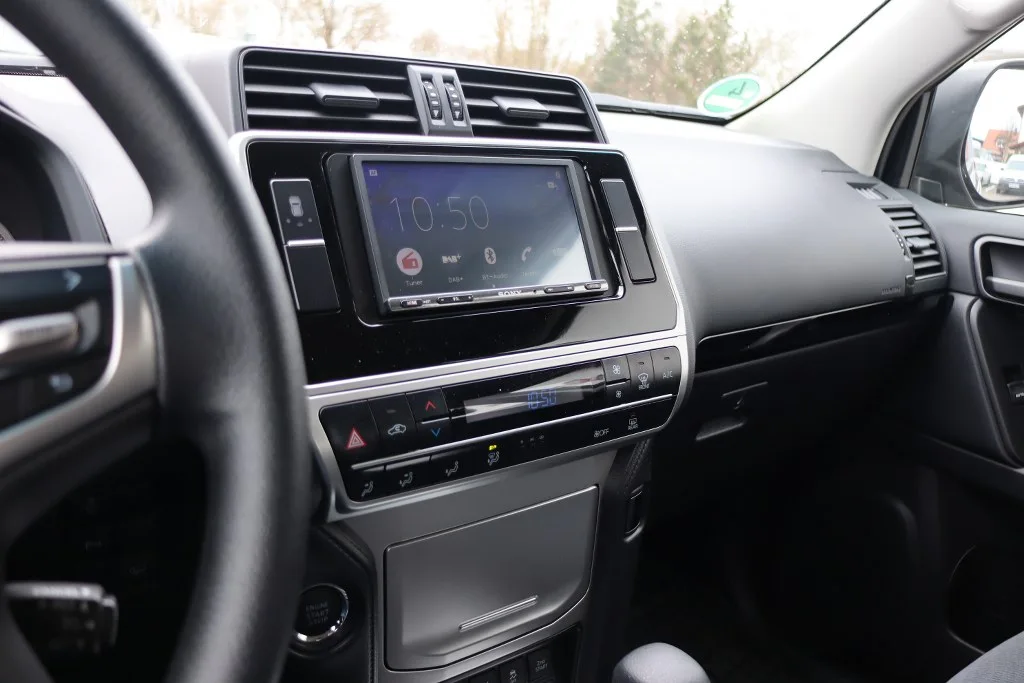 Der Toyota Land Cruiser J15 wurde mit einem modernen Radio-Tausch aufgerüstet, wobei die Lenkrad-Tasten weiterhin voll funktionsfähig geblieben sind.